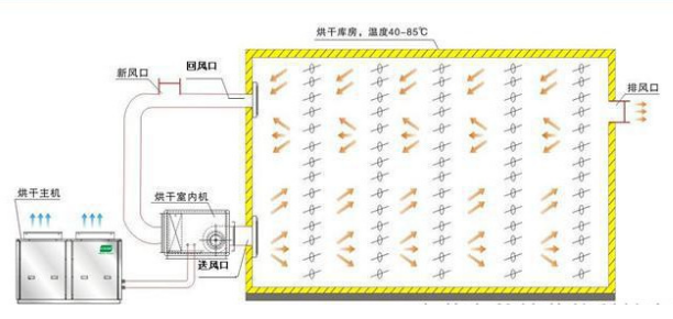 通過壓縮機做功,驅動管路中的傳熱工質吸收外界環境中的熱量(空氣中的熱量)在進行壓縮做工使其變成高溫高壓氣體,再通過換熱裝置將熱量釋放到烘干房內,通過熱風循環系統進行不斷烘干的過程。