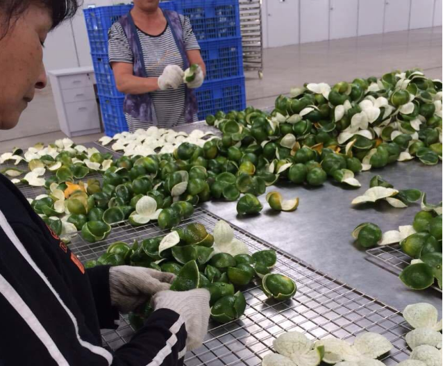 選擇青橘子,用刀在表皮劃開3道口,然后完整的把橘子皮取下,過程中注意保證橘子皮的完整性。