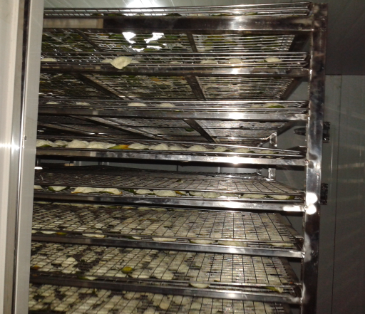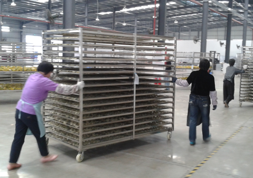 將撥好的橘子皮均勻鋪放到物料車托盤上,并將物料車推入熱泵烘干房。